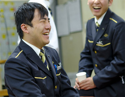 運転中は気が張っていますが、休憩時には同僚との談笑でリラックスできる一時です。